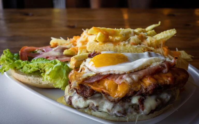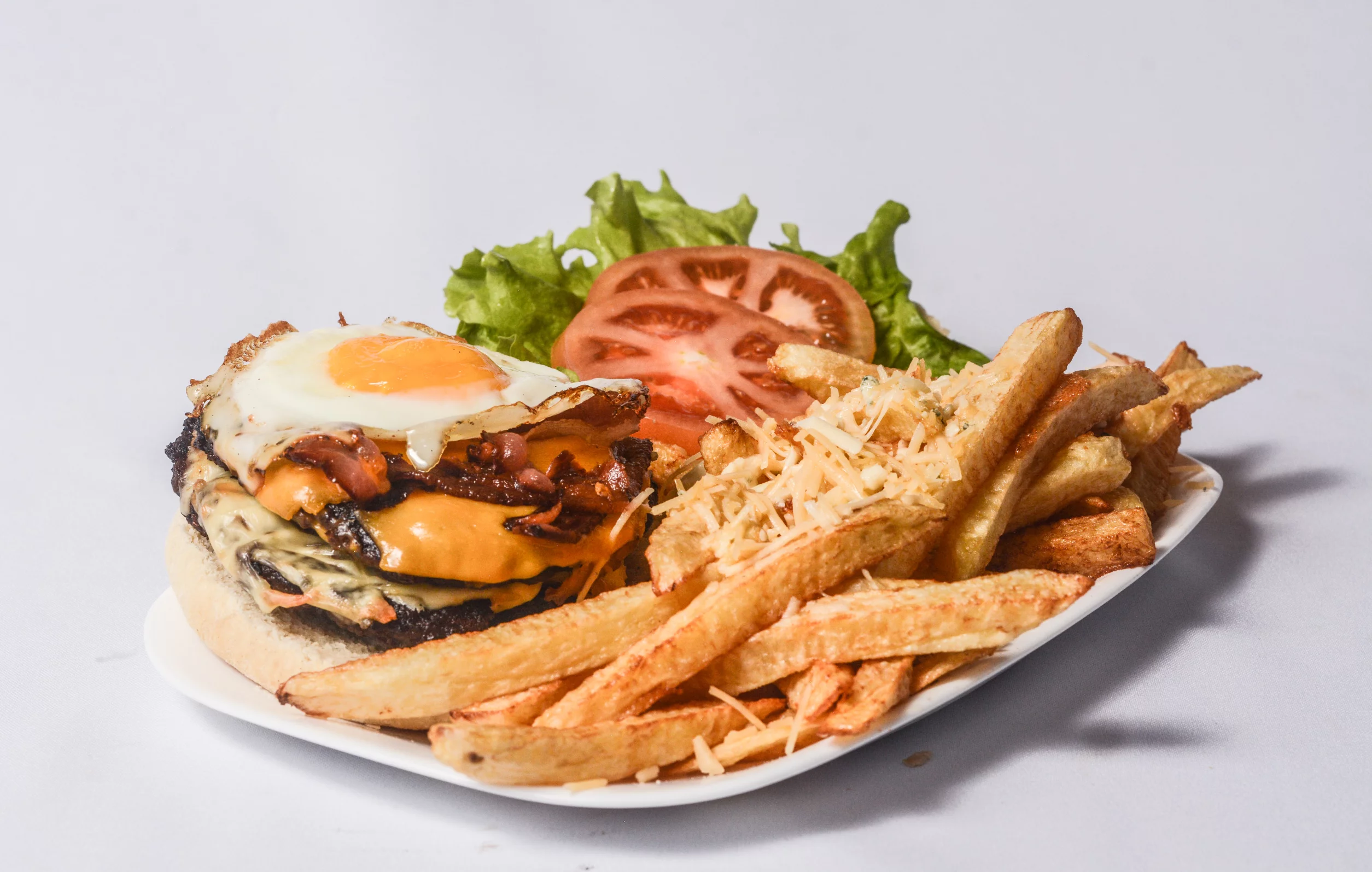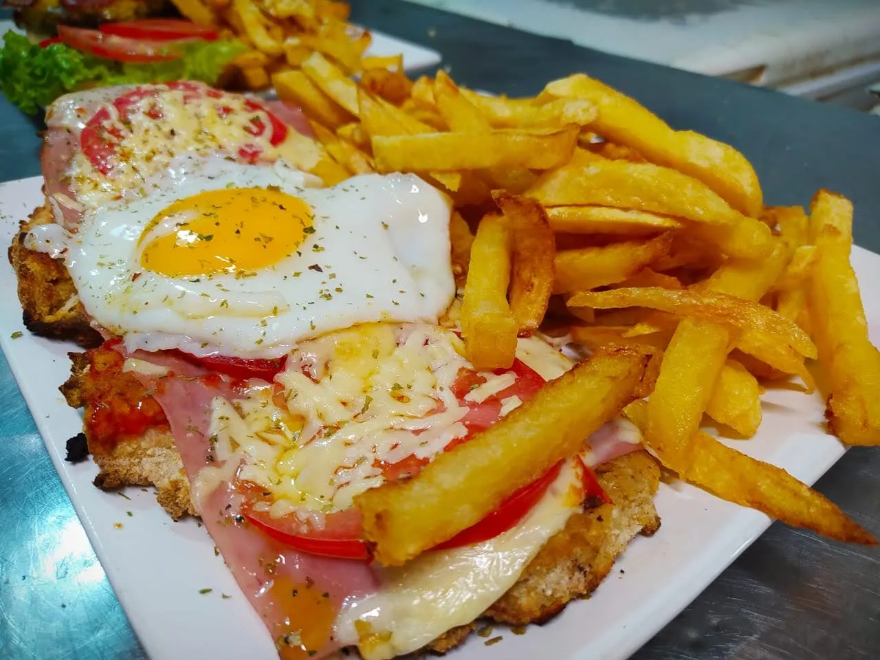 - 3 huevos fritos, panceta, morrones